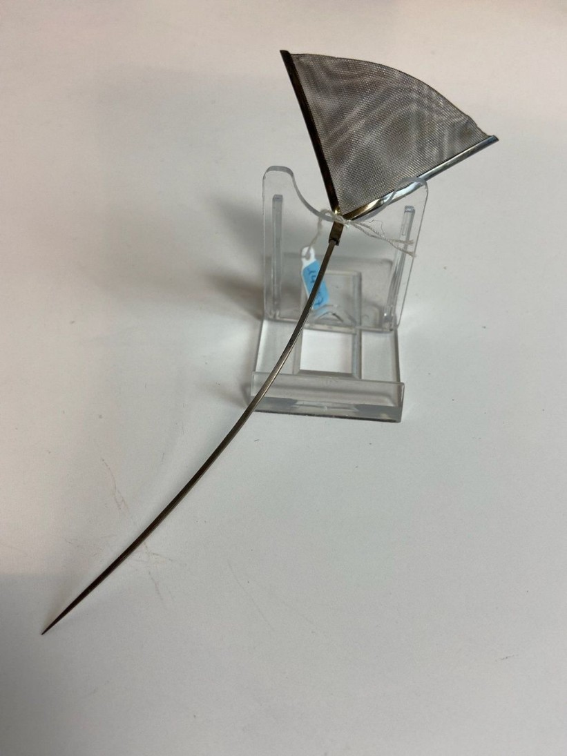 Antoinette Riklin-Schelbert (*1920 Zürich). Silber und Stahlgeflecht. Eine geschwungene und gekantete Nadel trägt ein dreieckiges, doppellagiges Netz, welches schwach mit den Spektralfarben gefärbt ist. Meistermarke S.