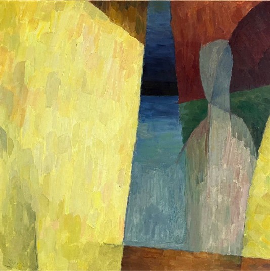 Eugen Cunz. Graue Figur in Farbflächen-Raum, Selbstportrait, 1985/6. Öl auf Leinwand, links unten signiert: Cunz. 70 x 70 cm. Gerahmt.