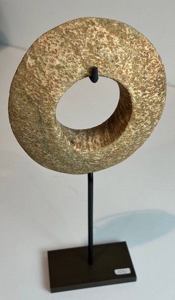 Grosser, schwerer Armreif aus hellbraunem Dolerit (?). Neotlithikum. Sahara, Mali, ca. 4500-2500 v. Chr. Präzise ausgearbeitet kreisrunde Form, zu den Rändern hin sich verjüngend. Perfekter Zustand. Gesockelt. B 4 cm Dm 15,3 cm