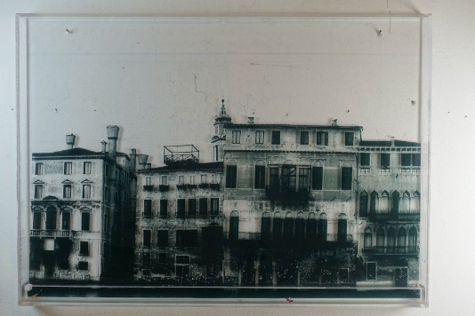 Europa 20 Jhd. Venedig. Fassadenansicht am Canale. Druck auf Plexiglas im Plexiglasrahmen mit Figuren im Wasser. 51 x 72 x 5cm