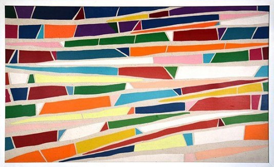 Piereo Dorazio. Komposition. Nr. 10, 1974. Collage mit farbigen Filzstreifen auf Filz über Spanplatte. Exemplar 43/50, verso signiert und datiert: Dorazio 1974.110 x 180 cm. Gerahmt Aussenmasse 120 x 189 cm..