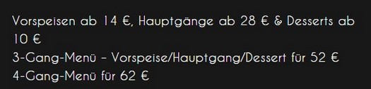 Vorspeisen ab 14 €, Hauptgänge ab 28 € & Desserts ab 10 €